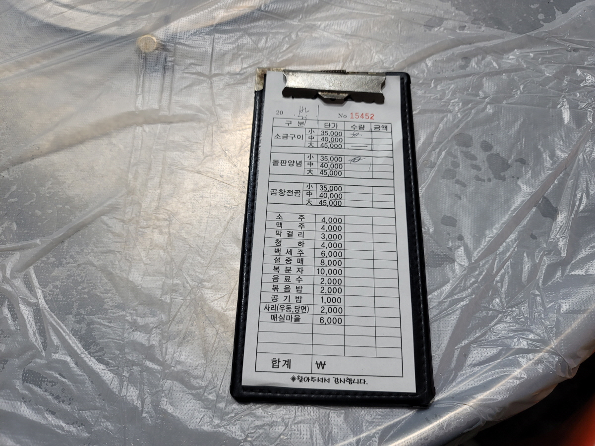 메뉴입니다. 소금구이, 돌판양념, 곱창전골이 있습니다.