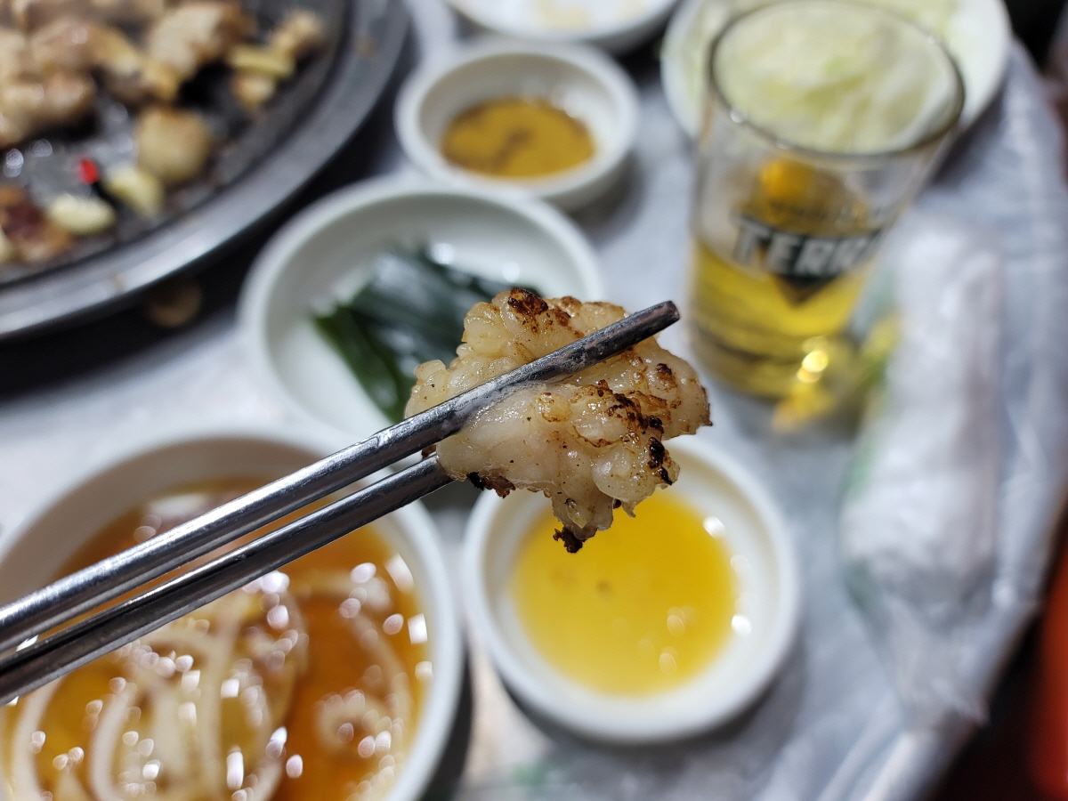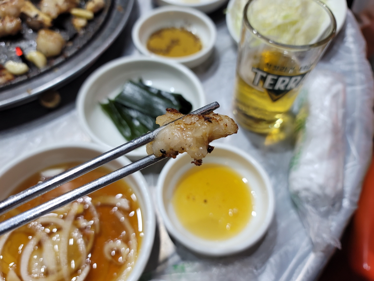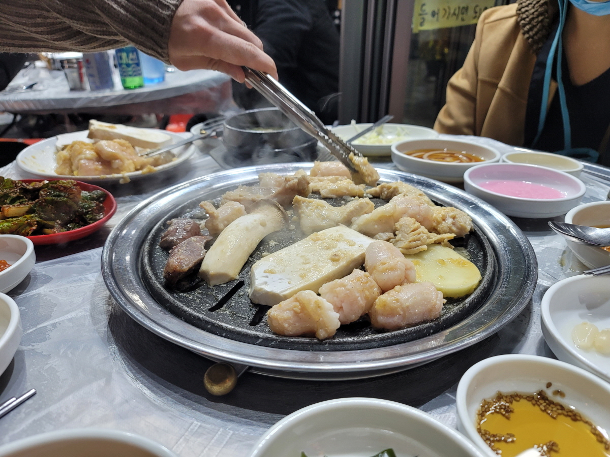 곱창전골 맛집인건지 주변 분들은 곱창전골을 드시는 것 같았지만 저희는 조쉬가 탕을 좋아하지 않아 곱창전골은 선택지에서 제외했습니다. 소금구이와 돌판양념 중에서는 개인적으로 소금구이가 더 맛있었던 기억에 이번에는 소금구이 대자로 하나 주문했어요. (4명)