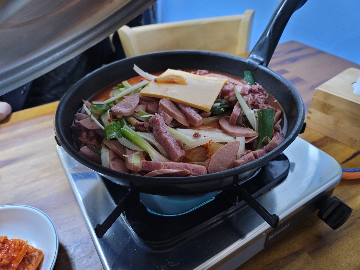부대찌개가 나왔다. 슬쩍 뚜껑을 열어보니 햄이 한가득 들어 있는 것과 두툼한 치즈가 올려져 있는 게 특이하다.