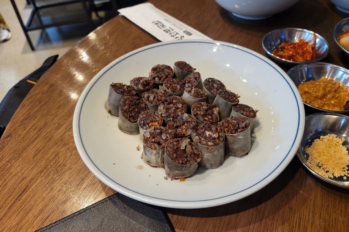 We ordered pork and rice soup (Dwaeji Gukbap) and blood sausage.