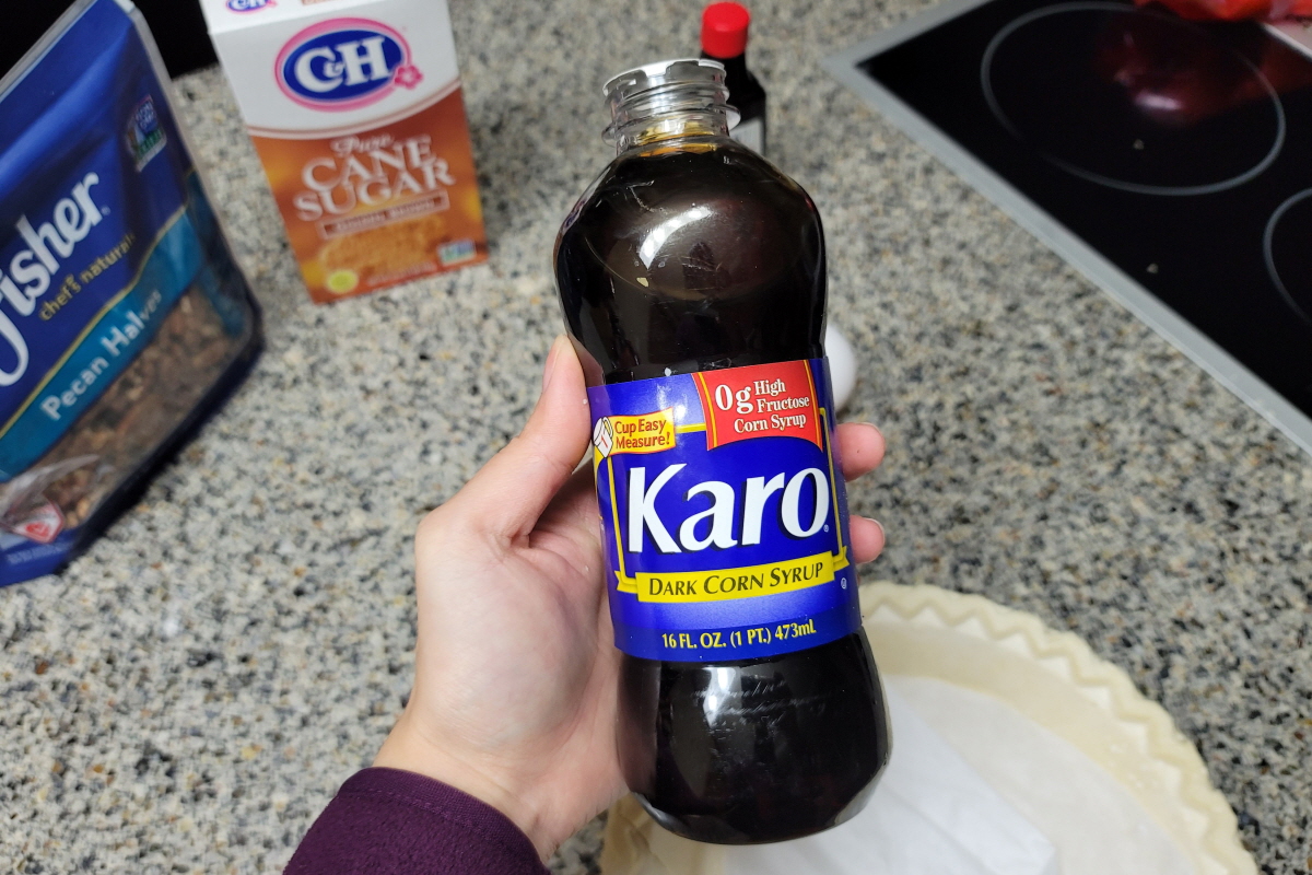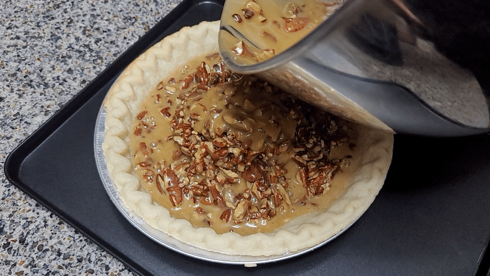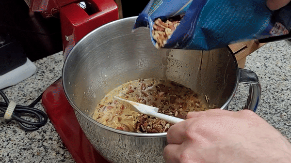 2. 녹인 버터에 황설탕, 콘 시럽, 계란, 바닐라 익스트랙, 피칸을 넣고 섞어주세요.