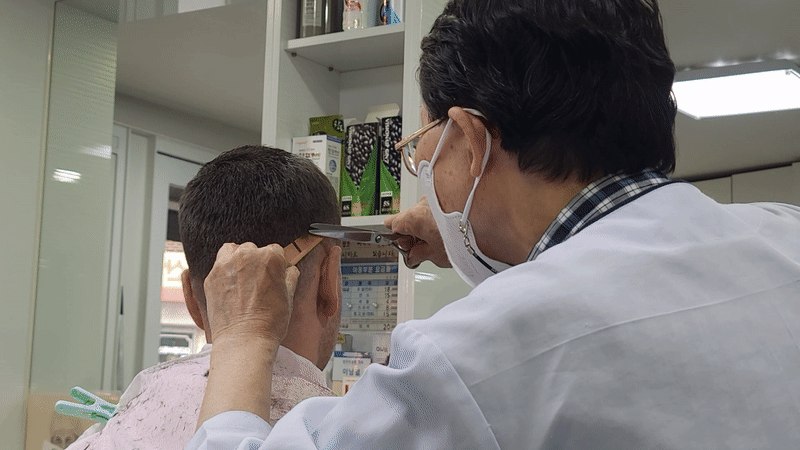 윗머리를 다듬고 옆머리를 깎습니다. 각종 성우이용원 영상이나 소개글에는 언제나 이남열 이발사가 면도칼이나 가위만 사용하는 모습만 봐서 그런가 바리깡을 들고 있는 모습이 왠지 낯섭니다.