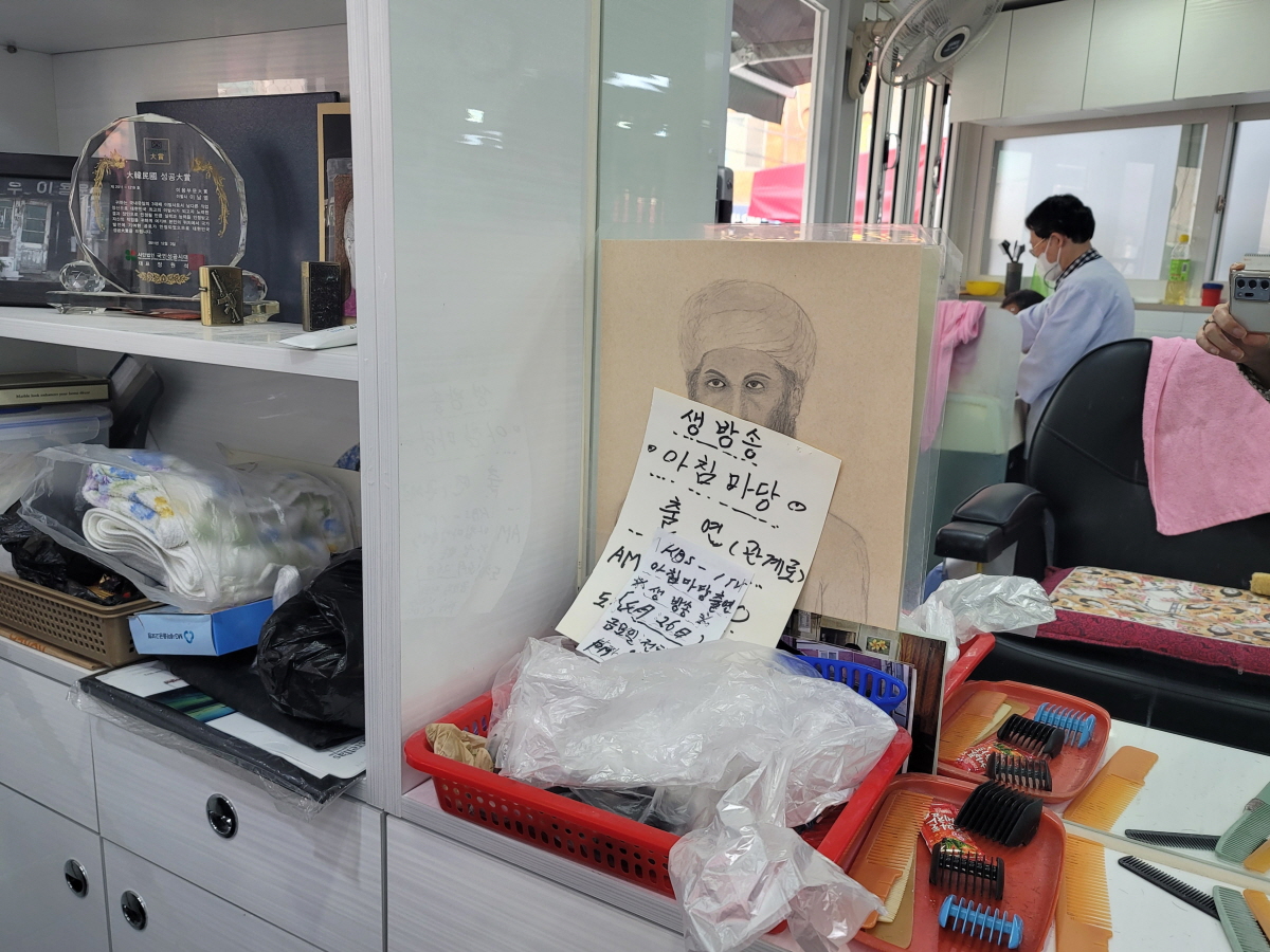 When I was taking pictures of the barbershop, Mr. Lee, who had been giving a haircut, explained why he drew Osama Bin Laden. It was not because he had sinister intentions, but because it was just easy to draw Osama Bin Laden's face. Mr. Lee also showed me a drawing of Lee Kunhee, the Samsung founder.