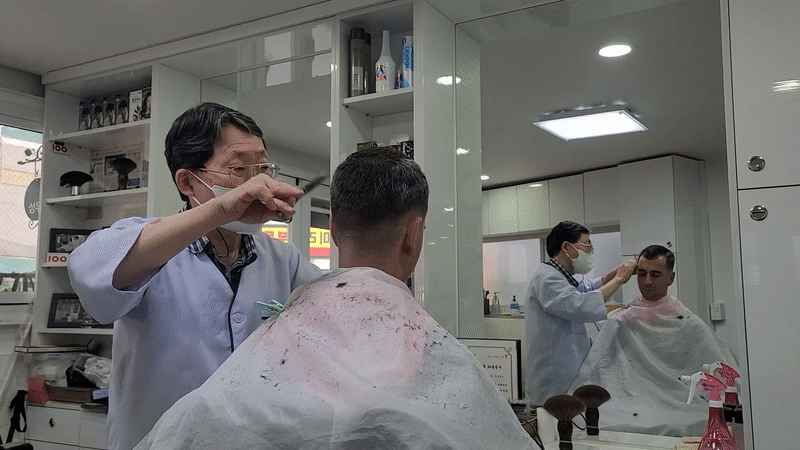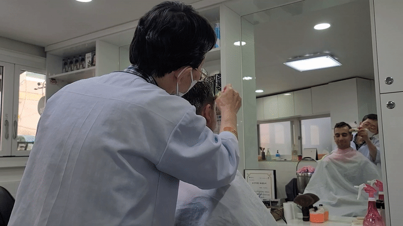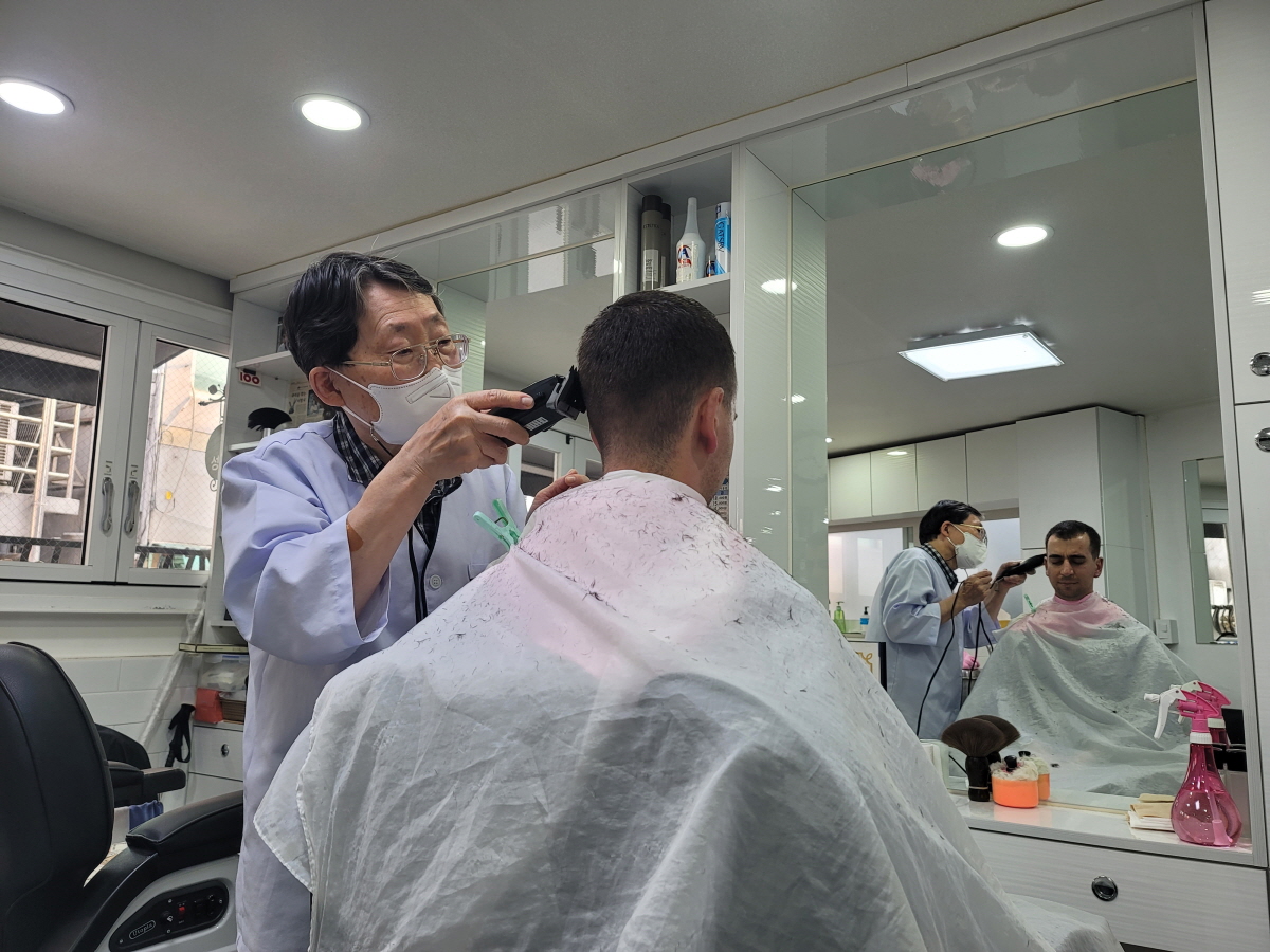 이남열 이발사께서 조쉬는 머리카락이 두피에 파고드는 스타일이라 머리 깎기 까다롭다고 하셨어요. 파고든 머리카락의 길이를 맞추기 위해 말 그대로 한땀한땀 정성스럽게 가위질을 합니다.