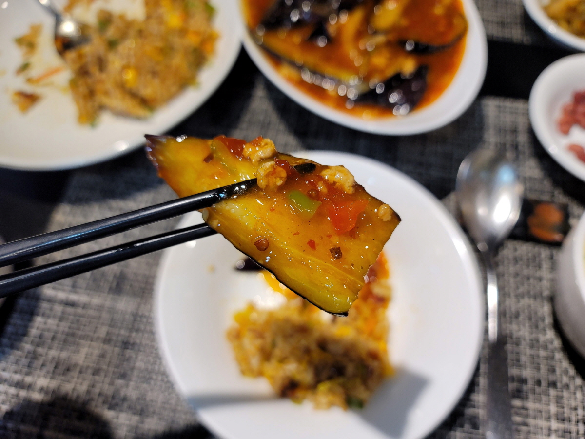 어향가지. 어향가지는 한국에도 잘 알려진 중국요리 중 하나다. 레시피도 쉽게 찾을 수 있고, 들어가는 재료도 특별하지 않아 집에서도 만들어 먹을 수는 있지만, 부엌의 화력 차이 때문인건지 갓 나온 어향가지의 가지가 뜨거워서 좋았다. 하지만 진진의 어향가지는 가지 탕이라고 불러도 좋을만큼 가지 양이 적고 소스가 많아 아쉽다. 소스는 많이 달지 않아 소스만 먹으려면 먹을 수도 있겠지만 창렬한 가지 양을 소스로 가리려고 노력한 느낌이다.