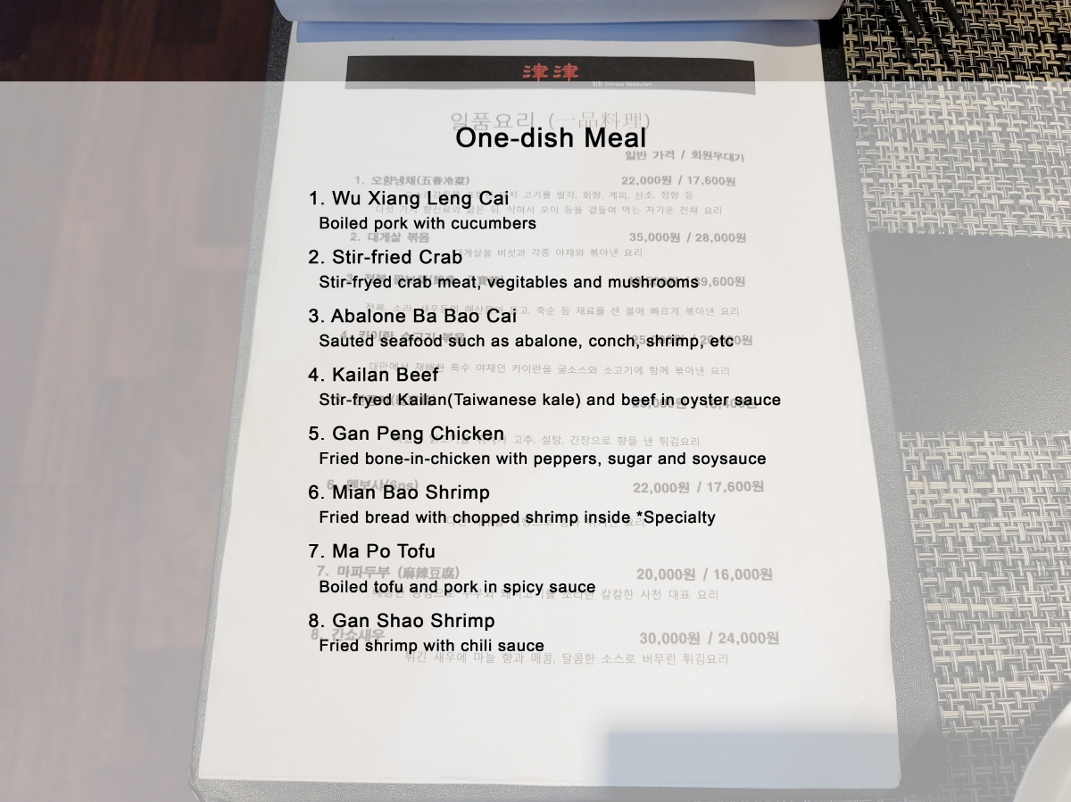 진진 음식은 전반적으로 가격대가 좀 있는 편인데, 3만원을 내고 진진 회원가입 하면 모든 요리를 20% 할인된 가격으로 먹을 수 있다. 메뉴판은 조금 허접한 편이다. 진진 메뉴 중 어향가지, 대게살 볶음, 멘보샤, 깐쇼새우가 유명한 걸로 알고 있다.
