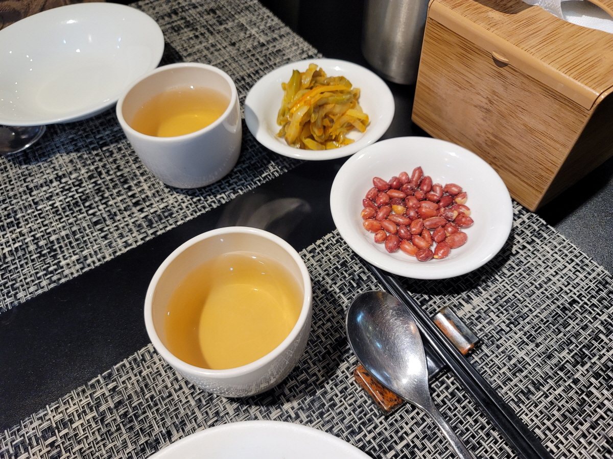 밑반찬으로 땅콩과 짜차이(위키백과에 따르면 짜차이는 갓의 한종류인 자차이의 뿌리를 그늘에 말렸다가 소금에 절여 꾹 짜서 먹는 중국 사천지방의 절임 음식이다)가 나온다.