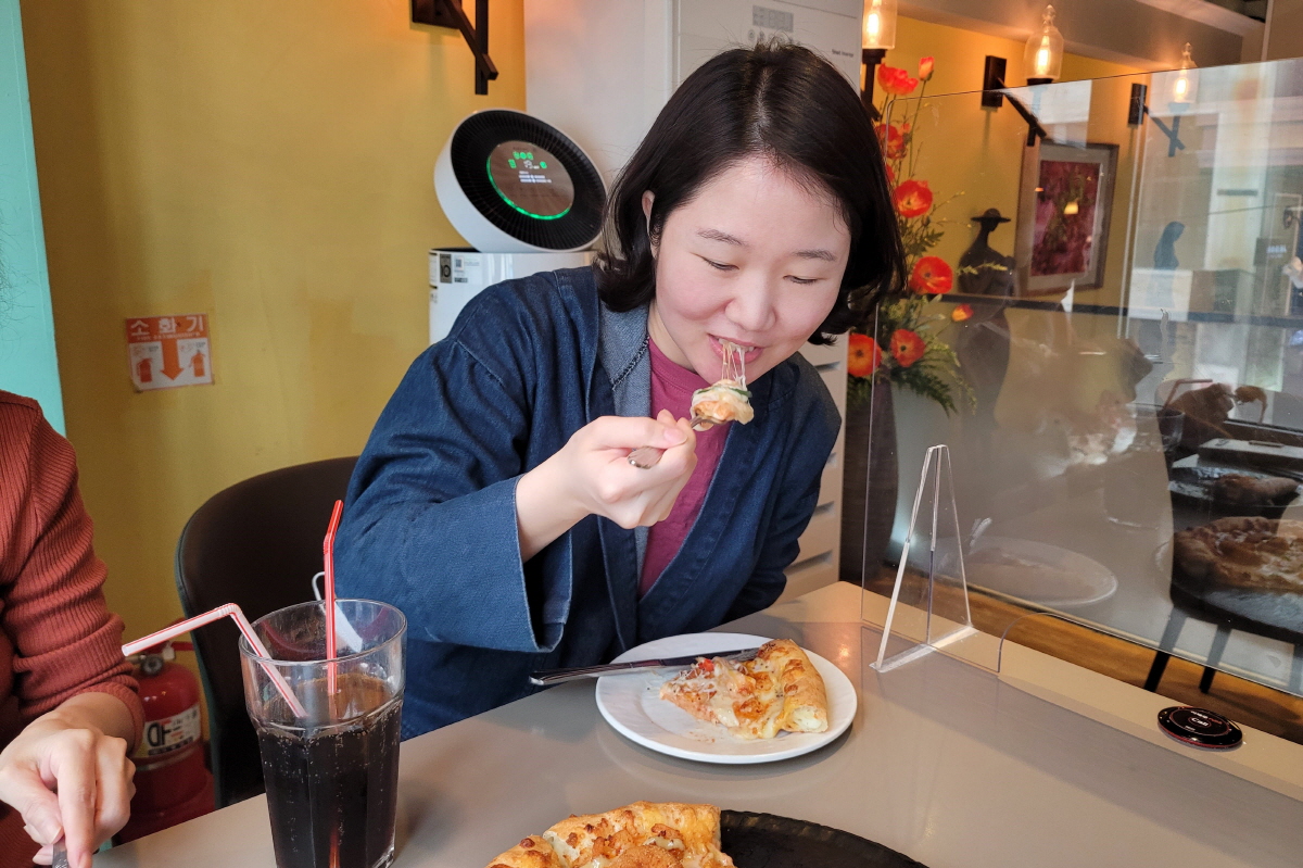 배가 꽤 큰 세 명, 배가 작은 한 명, 총 네 명의 성인이 라지 사이즈 피자 한 판을 먹었는데요, 재료(특히 치즈)를 아낌없이 넣은 피자 덕분에 한 판만 주문해도 충분했습니다. 물론 배가 엄청 고픈 날이라면 성인 여자도 피자 네 조각 반 충분히 먹을 수 있어요. 우리 언니 리스펙ㅋㅋ