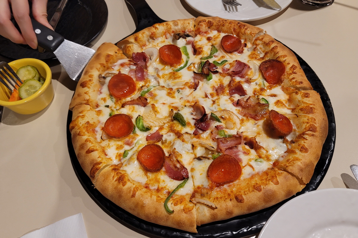 My mother likes shrimp pizza more, but I like this pizza that tastes simple but with obvious quality care. It is like no matter how delicious a brand new chicken was, people finally come back to choose original fried chicken (with sweet spicy sauce).