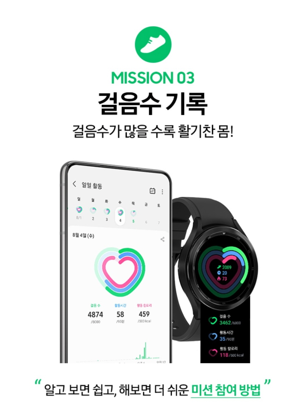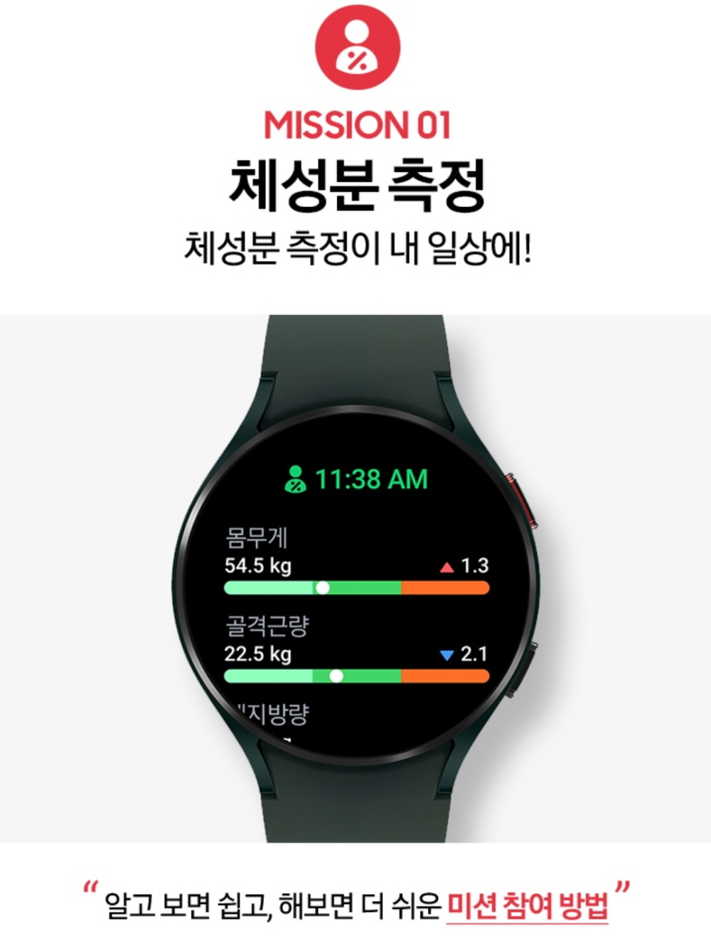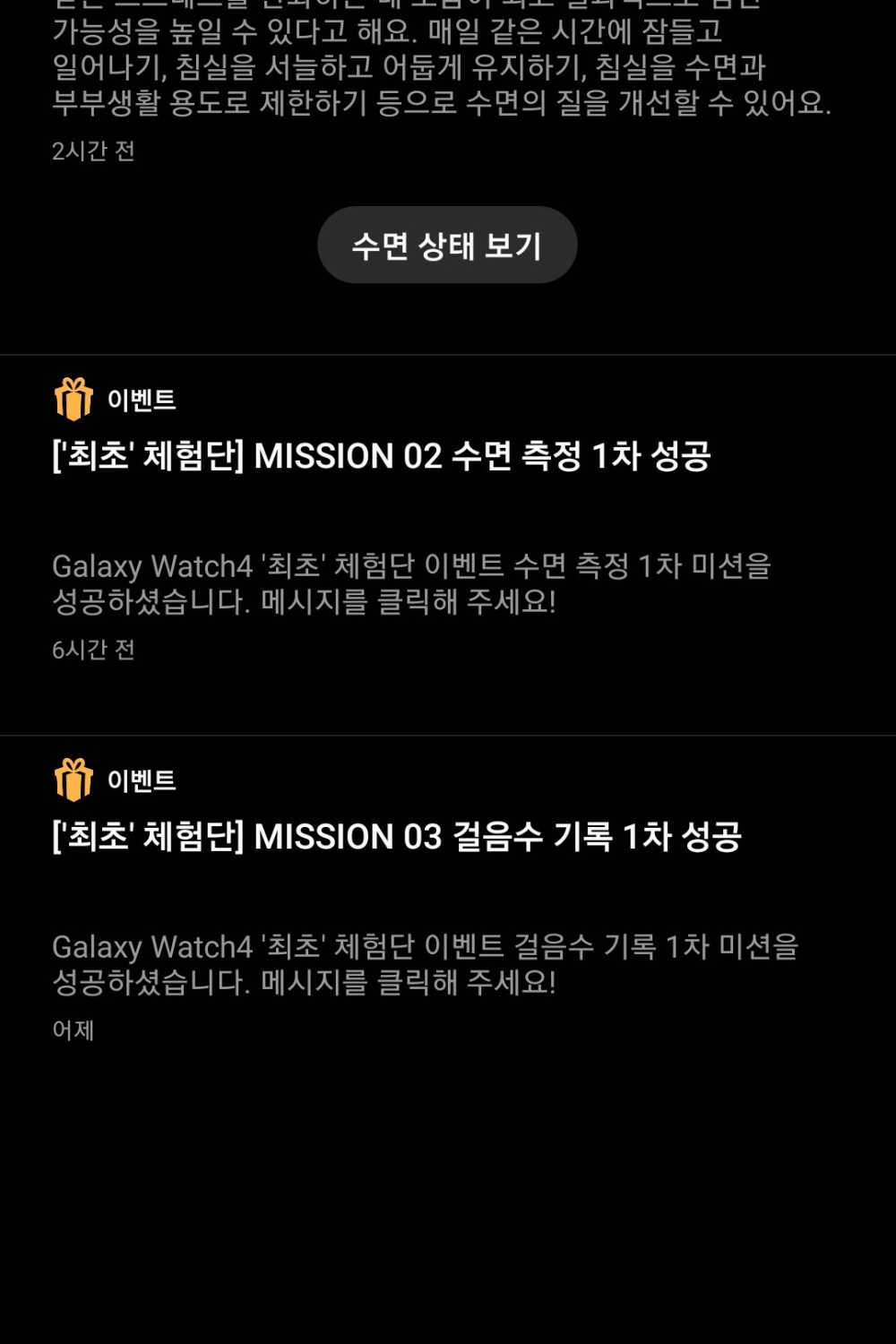 체성분과 수면 측정 미션의 경우에는 미션을 완료하면 '당신을 위한 추천'에 자동으로 이벤트 성공 메시지가 도착한다.