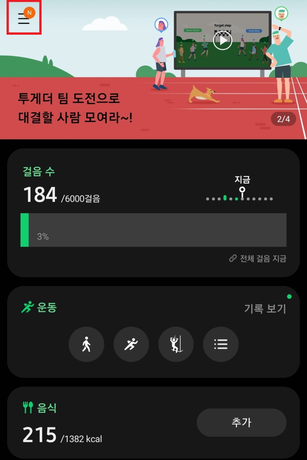 걸음수 기록 미션의 경우에는 우선 워치에서 '걸음 수'를 클릭한다. 아래로 쭉쭉 내려가서 '폰에서 보기'를 누른다. 휴대폰 삼성헬스앱에 자동으로 연동되면 위의 사진 빨간 네모박스 '일일활동'을 클릭한다. 그리고 삼성헬스앱 좌측 상단의 '≡' 버튼을 누른다. 다음으로 '당신을 위한 추천'을 클릭하면 이벤트 성공 메시지가 도착해 있을 것이다. 이를 클릭하면 이벤트 참여 끝! (기간내 10회 반복해야 한다.)