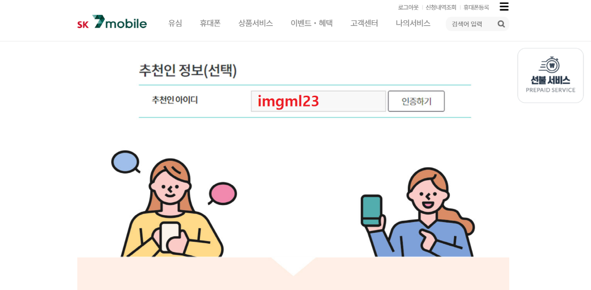 SK세븐모바일에 가입할 예정이라면 신청서 작성 시 추천인 아이디에 imgml23(아이엠쥐엠엘23)을 추가해주세요.