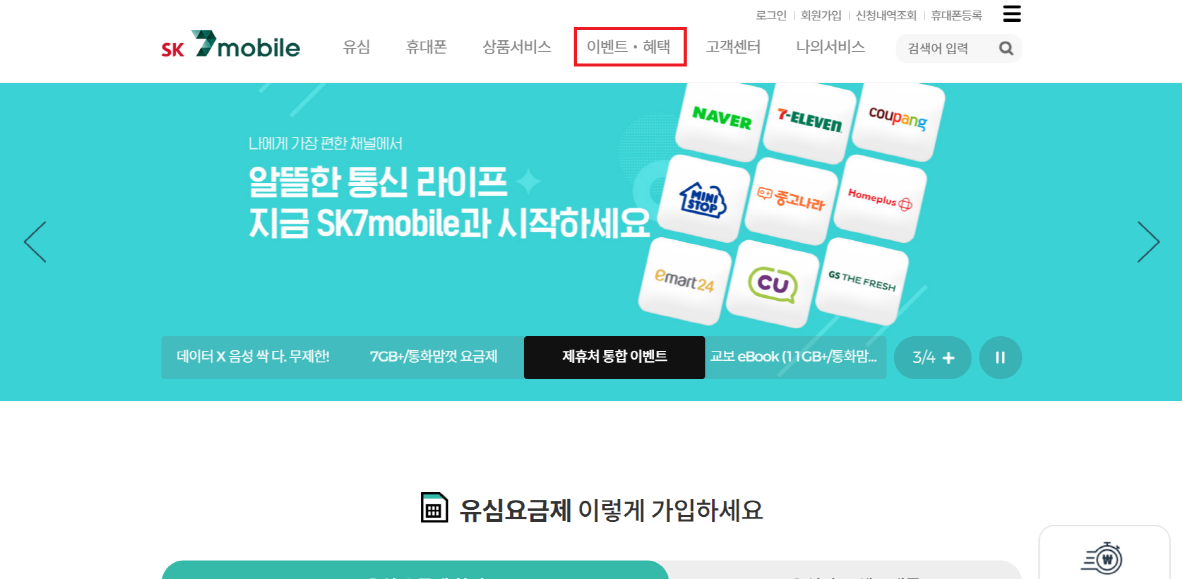 어떤 이벤트가 진행중인지 궁금하다면 SK세븐모바일 공홈에 들어간 후 이벤트·혜택 > 진행이벤트를 클릭한다.