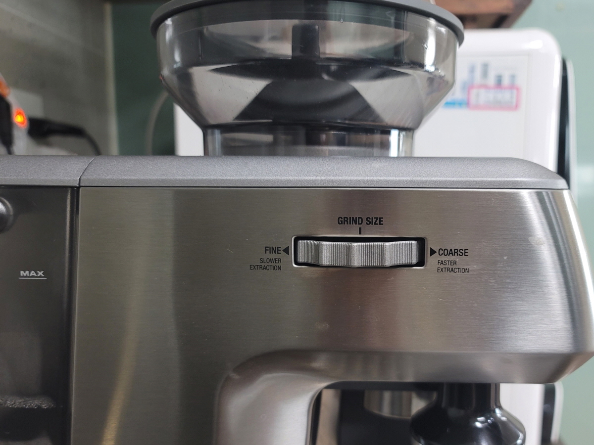 브레빌870 왼쪽에는 그라인더 굵기를 조절할 수 있는 버튼이 내장되어 있다.