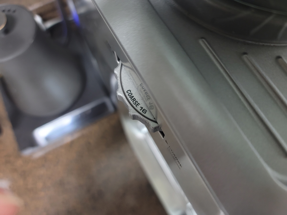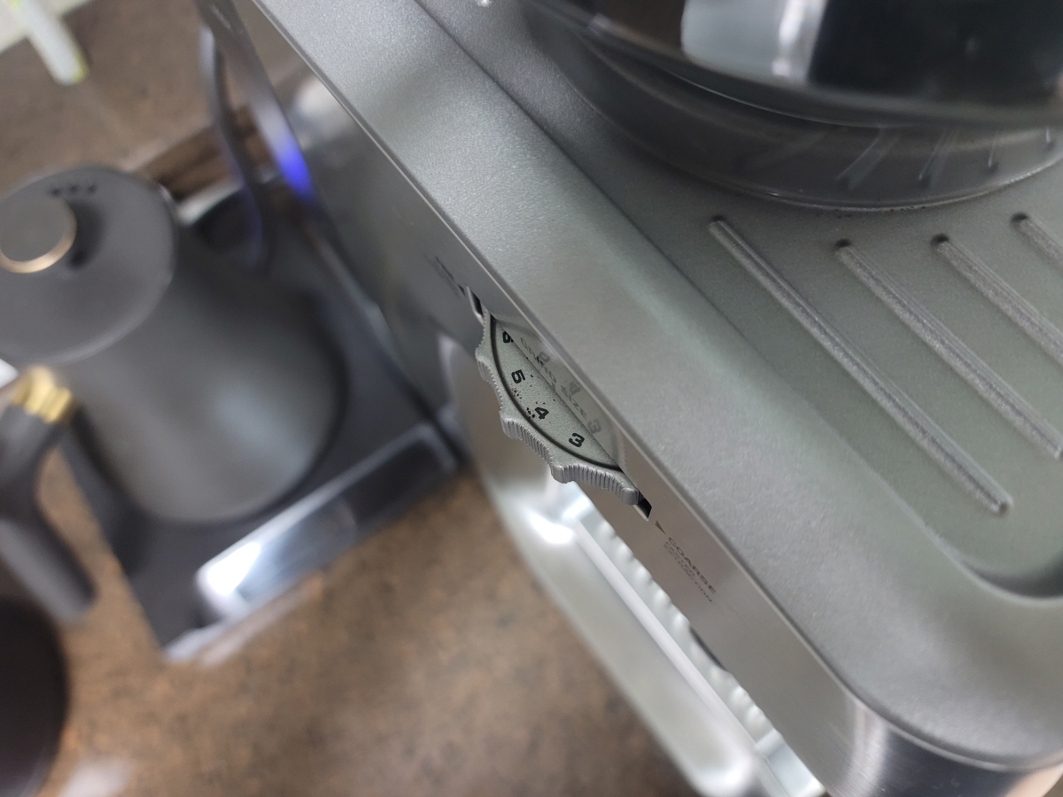 브레빌870 왼쪽에는 그라인더 굵기를 조절할 수 있는 버튼이 내장되어 있다.
