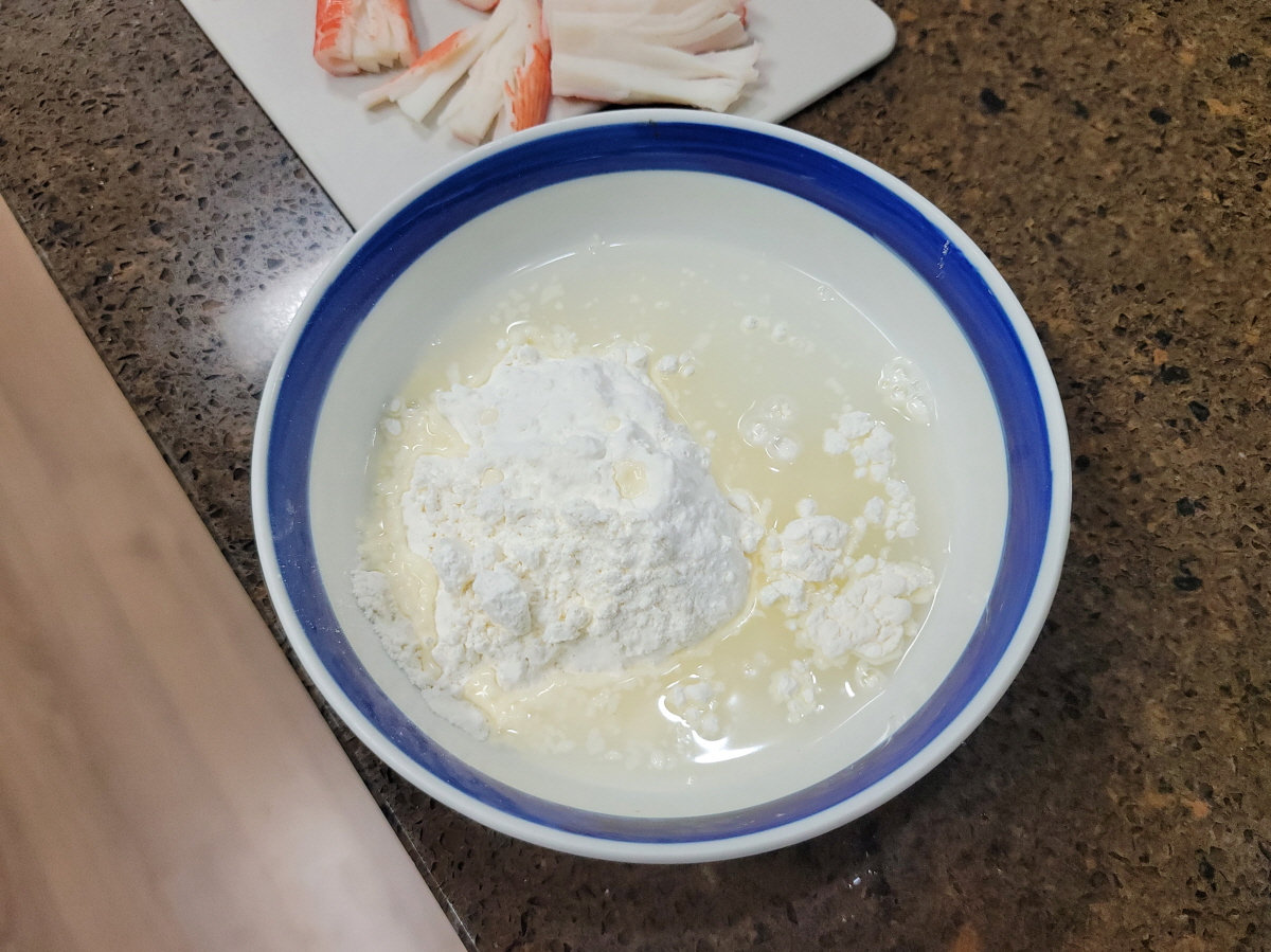 튀김가루 2/3컵에 물 반 컵을 넣어 튀김옷을 준비하고 손질한 게맛살에 튀김옷을 묻혀준다.