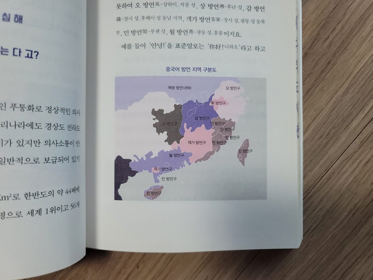 중국에는 7대 방언이 있다. 북방 방언(官话, 北京话 표준어), 오 방언(吳 wú : 상하이, 저장성) , 상 방언(湘 xiāng : 후난성), 감 방언(赣 gàn: 장시성, 후베이성 동남부), 객가 방언(客家 : 장시성, 광둥성 동북부), 민 방언(闽 mǐn : 푸젠성), 월 방언(粤 yuè : 광둥성, 홍콩)