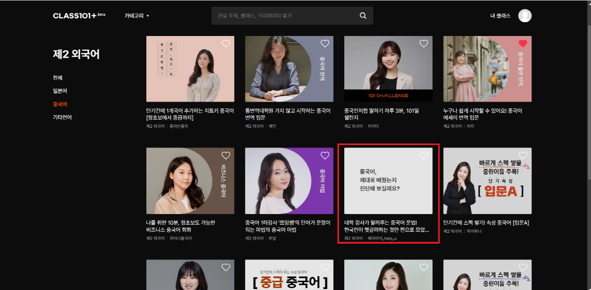 클래스101+에서 메이아이님의 <대학 강사가 알려주는 중국어 문법! 한국인이 헷갈려하는 것만 찐으로 모았다! 작문은 덤>을 수강 중이다. 중국어 기초를 배워야 하는 수준은 지났기 때문에 중국어 문법 수업을 들을 마음은 전혀 없었지만 관심분야가 외국어다 보니 습관적으로 외국어/중국어 탭을 눌렀고, 심플한 대표사진 때문에 메이아이의 강의에 절로 눈이 갔다.
