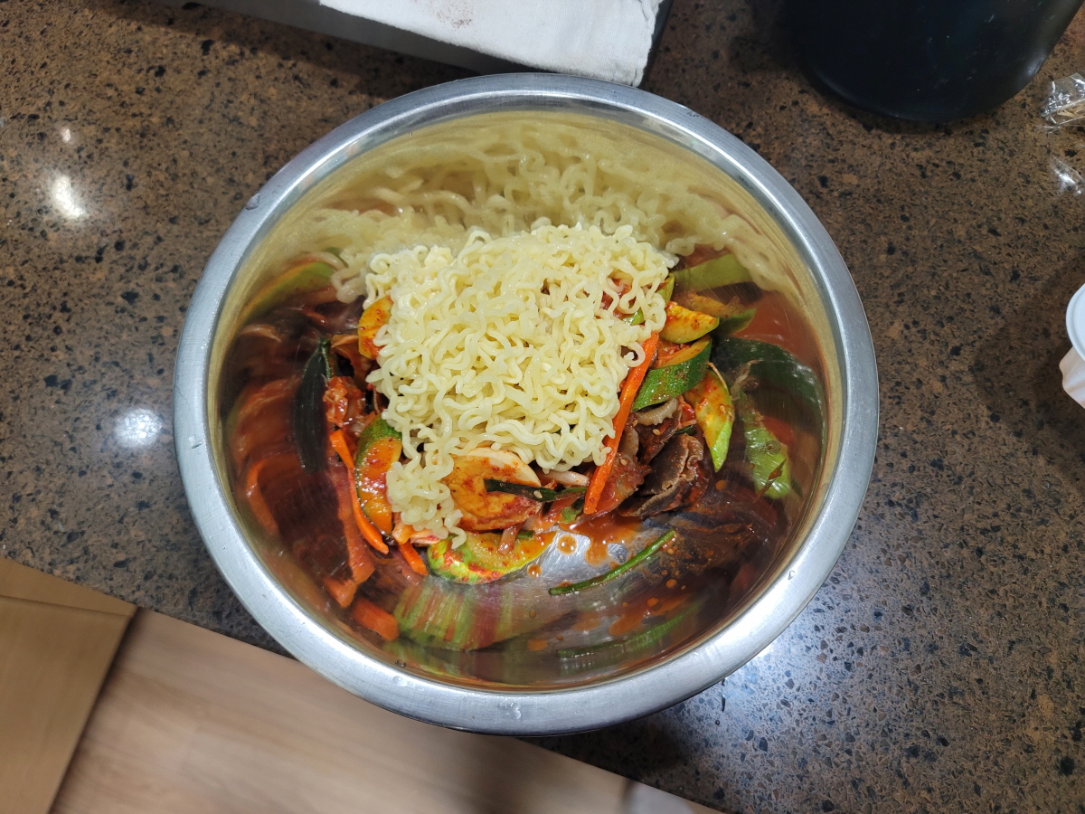 라면사리를 넣으니 조금 더 맵고, 더 달달한 비빔면 같았다.