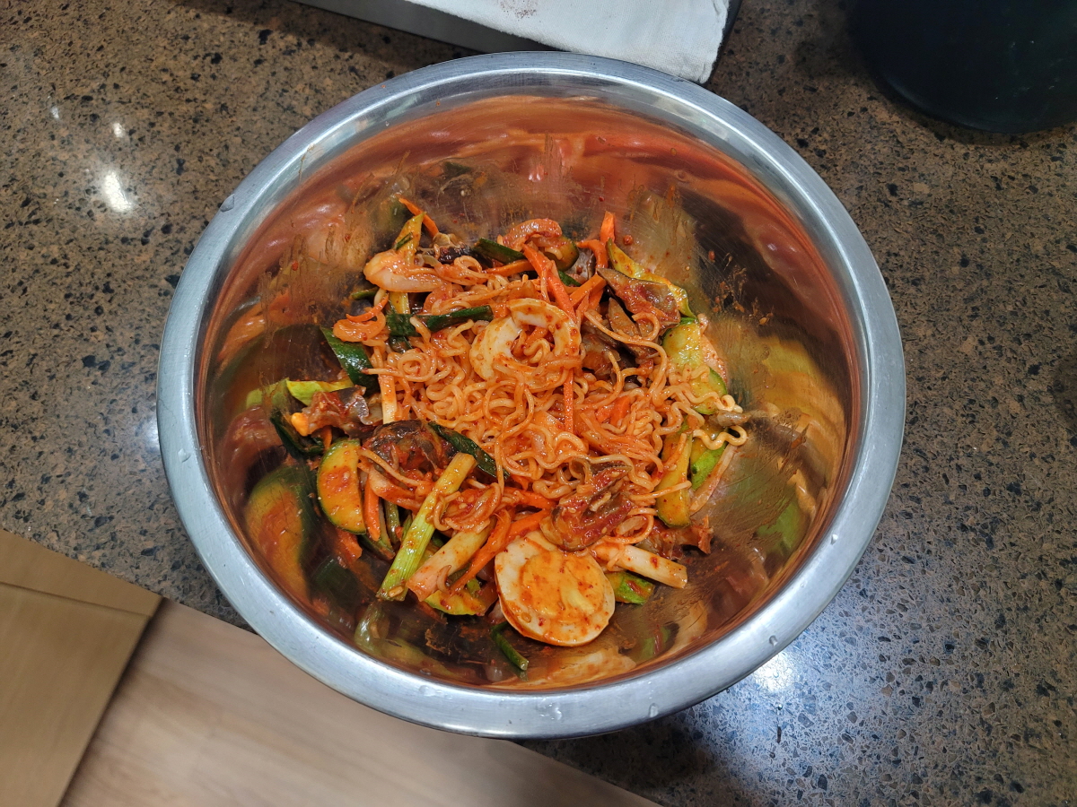 다음날 점심에 남은 골뱅이 오이무침에 라면사리, 참기름을 넣어서 비벼 먹었다.