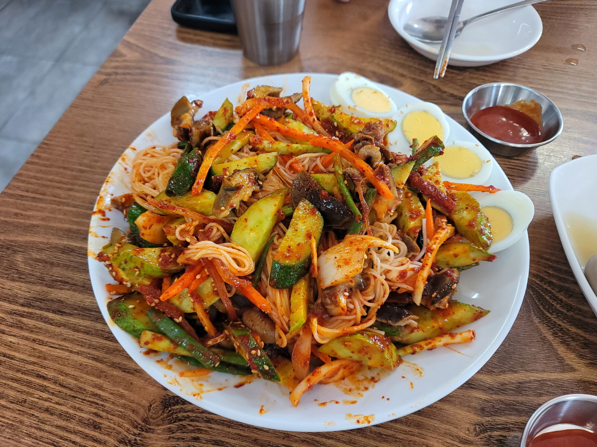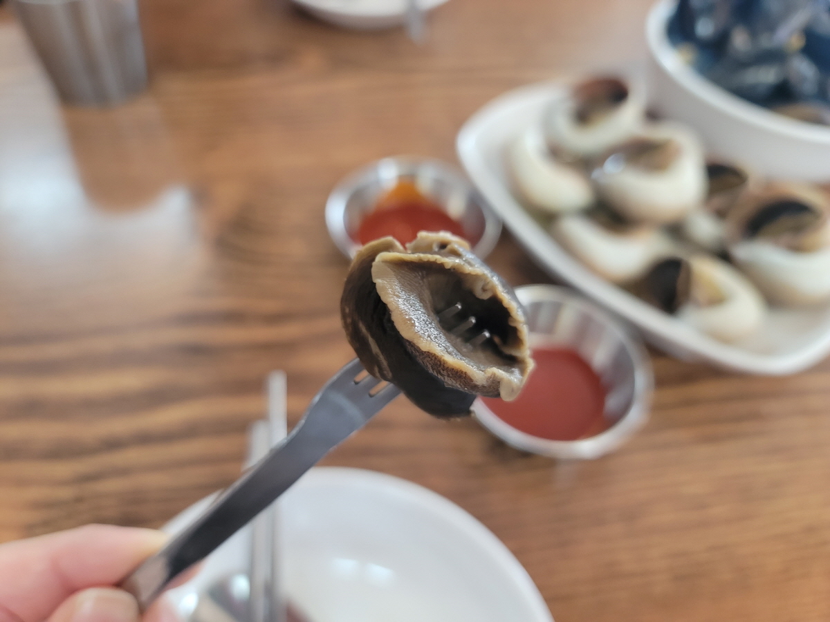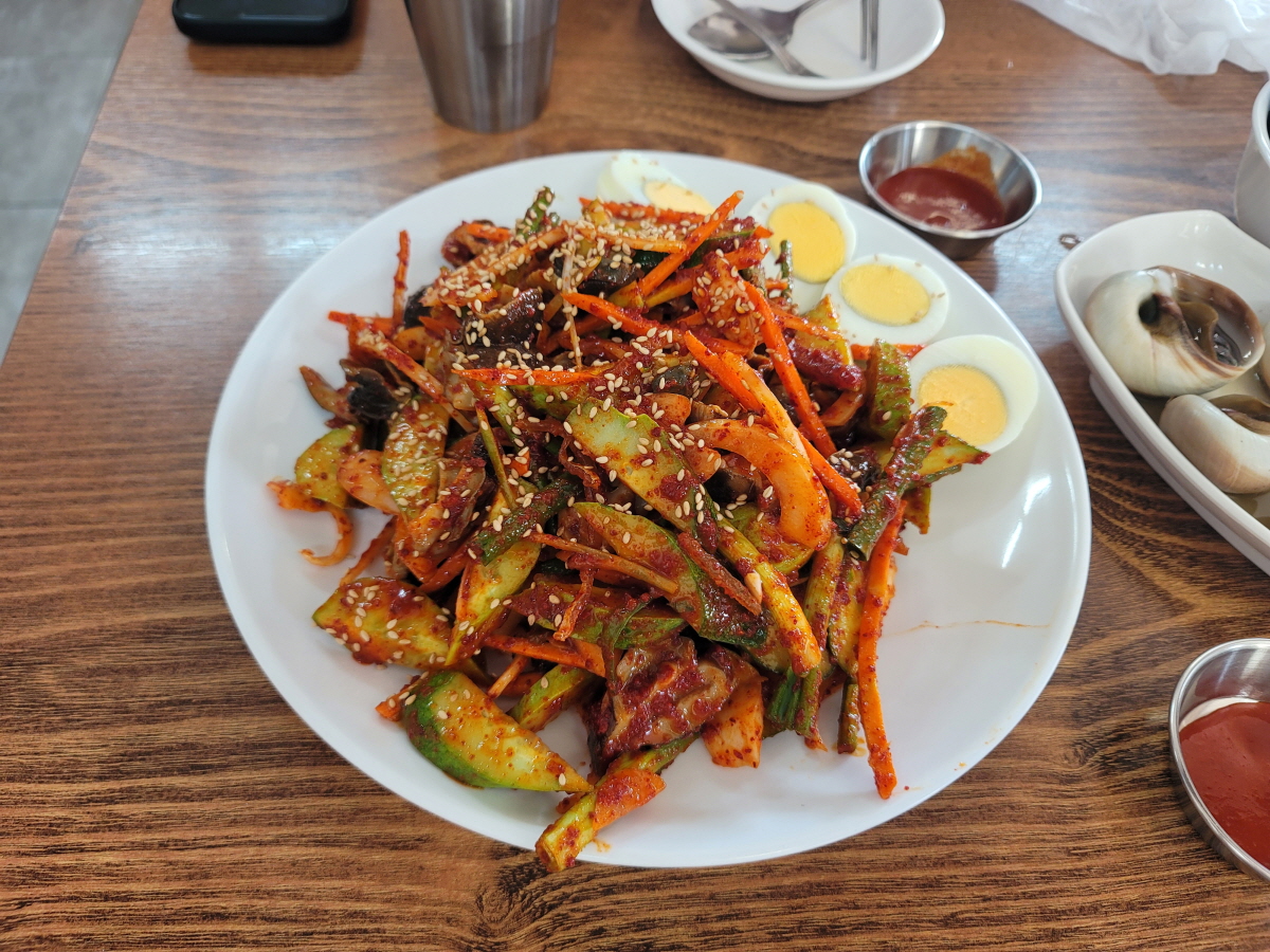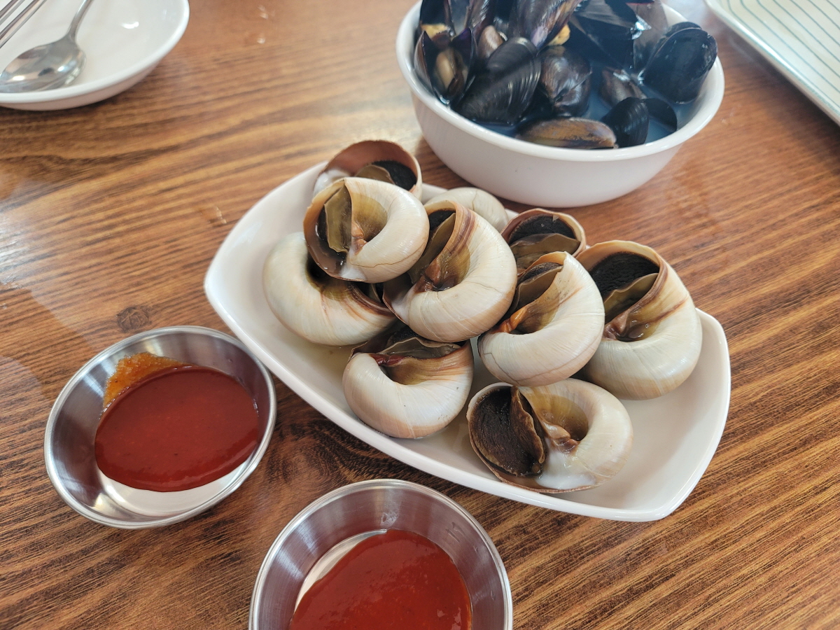 커다란 골뱅이가 가지런히 담겨 나와서 눈이 즐겁다. 하지만 간이 너무 심심했다. 씹는 맛은 있는데 뭘 씹고 있는지 모르겠다고 할까? 식당에 들어가기 전 고동 삶은 냄새가 확 나길래 바다향 가득한 고동과 비슷한 맛이 날 줄 알았는데, 골뱅이는 원래 이런 무(無) 맛인 걸까.