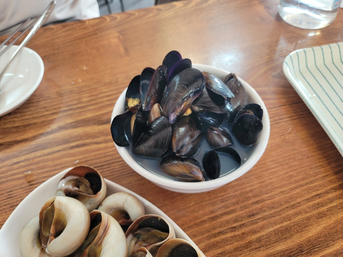 음식을 주문하면 홍합이 나온다. 서비스인데도 홍합이 실하다.