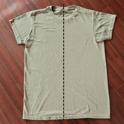 1. 옷을 펼칩니다. 옷 중간선에 맞춰 양쪽을 접어줍니다.
