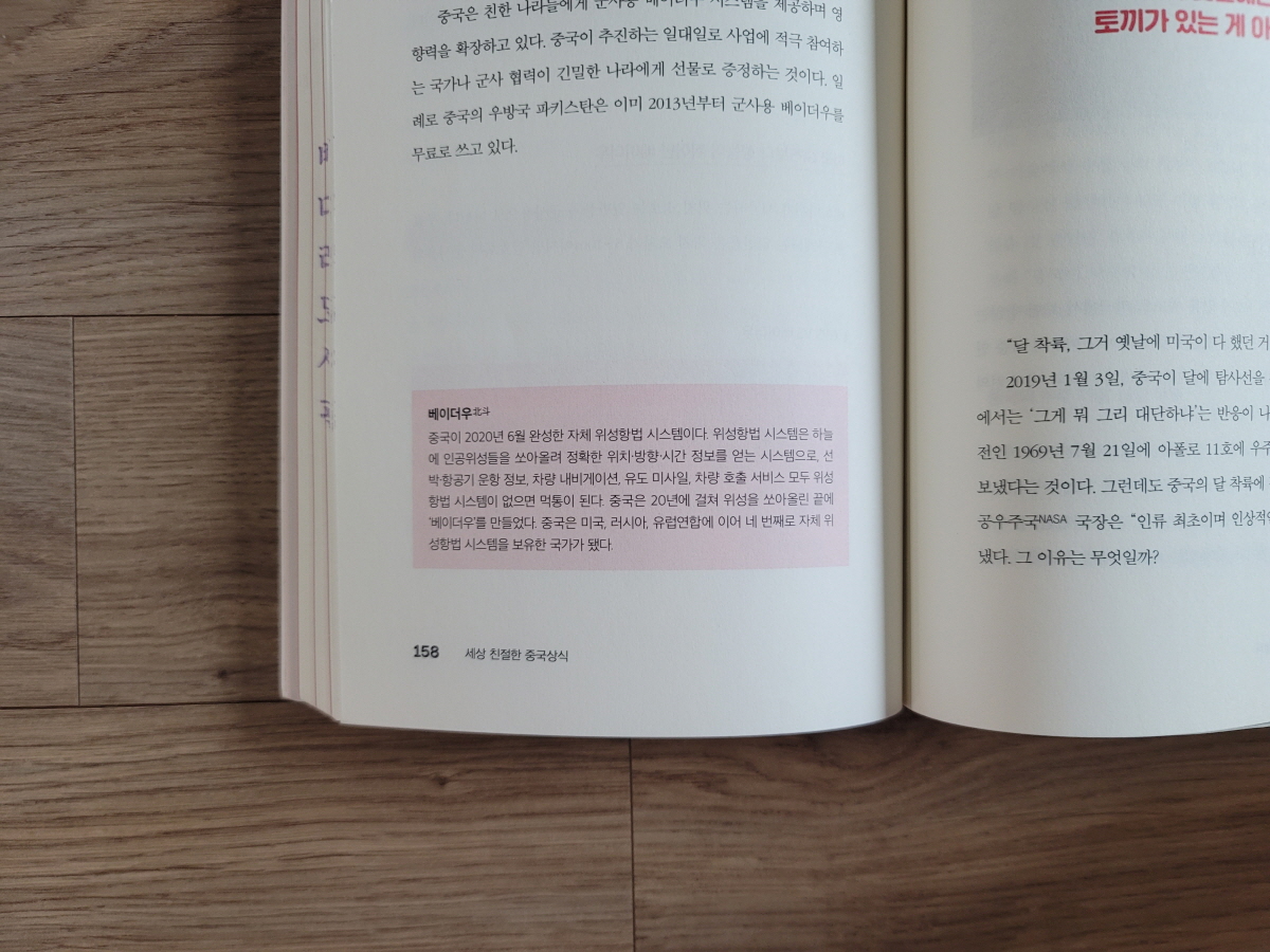 그런데 《세상 친절한 중국상식》에 의하면 이제 중국에서는 물건을 계산하지 않고 마트를 나와도 물건 값이 자동으로 계산되고, 운전자가 없는 택시가 시범 운영되고 있다고 한다. 중국의 GPS 베이더우는 10cm의 오차도 잡아내는 수준에 이르렀고 이는 미국의 GPS 기술력보다 앞선다고 하니 중국의 기술이 하루가 다르게 발전하고 있는 듯하다.