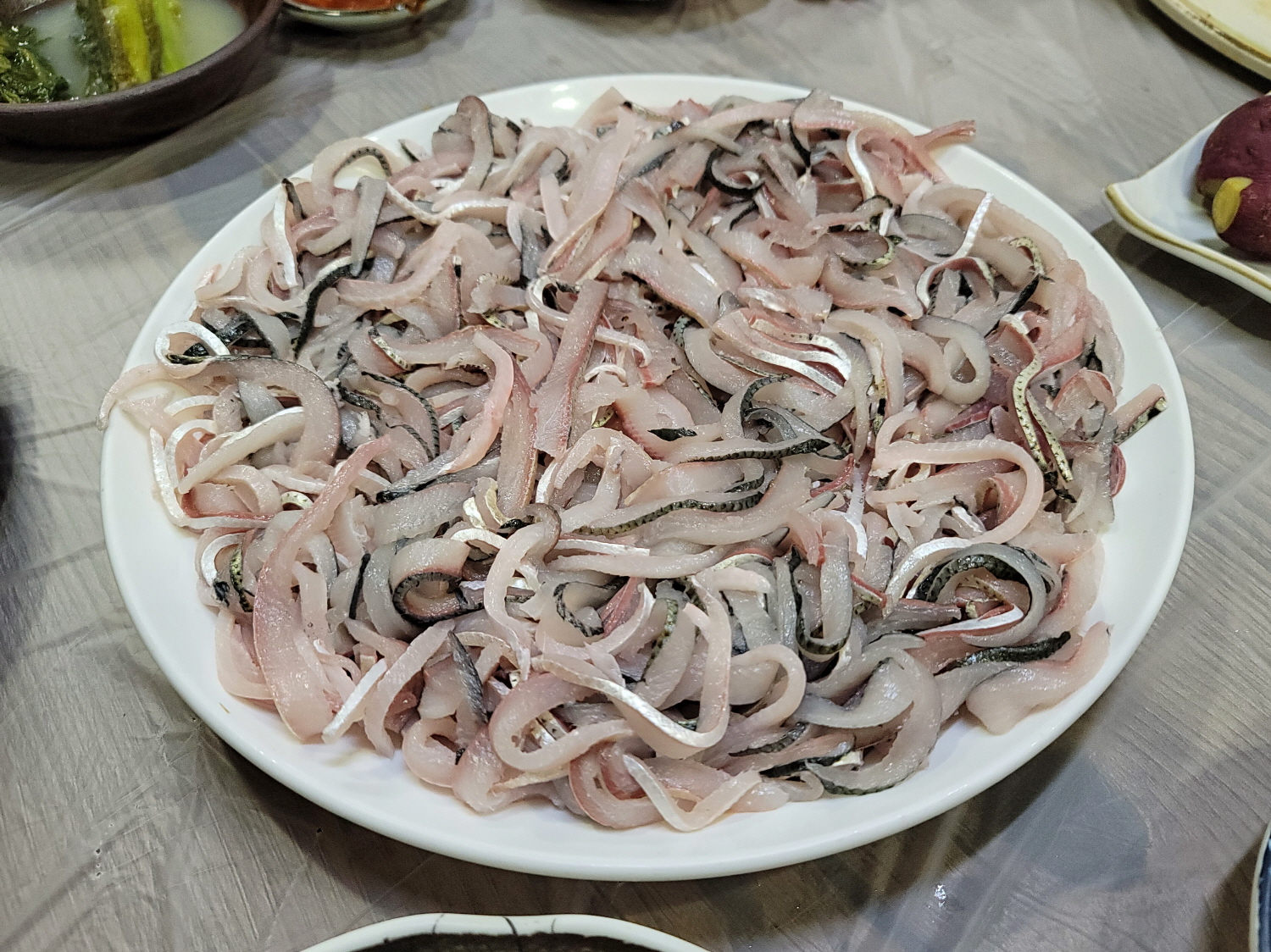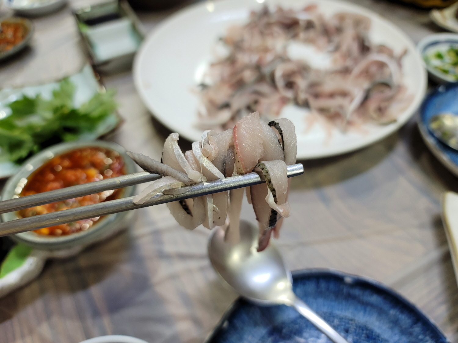 저는 부산에서 나고 자라서 청소년기부터 회를 즐겨먹었지만 한 번은 저희 언니가 회를 먹으며 '회가 기름지다'라던 말을 듣고는 조금 벙쪘어요. 저는 회가 기름지다고 느껴본 적은 없었거든요. 그런데 이번에 먹은 전어는 정말 기름졌어요!! 회는 초장 맛이라는 신념 하에 살았는데 회만 먹어도 너무 맛있어서 간장 살짝 찍어먹다가 나중에는 간장도 없이 회만 먹었어요.