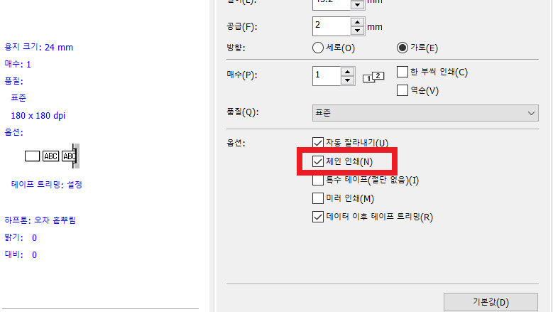 인쇄 설정에서 '체인 인쇄'로 세팅해주지 않으면