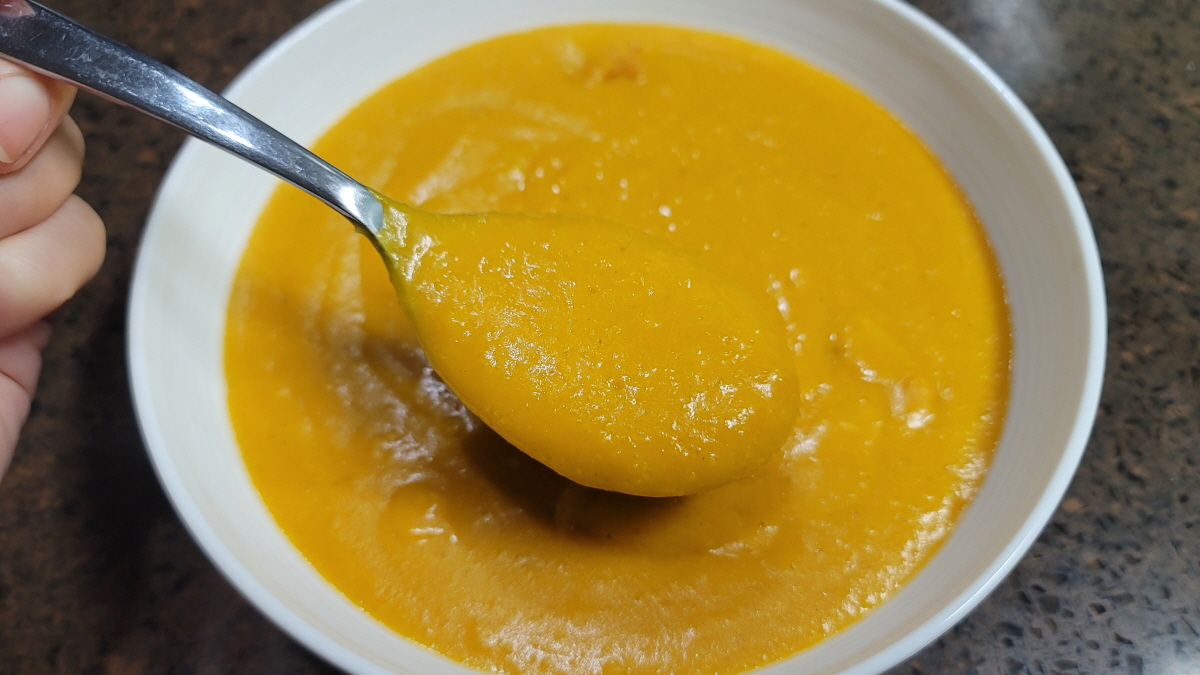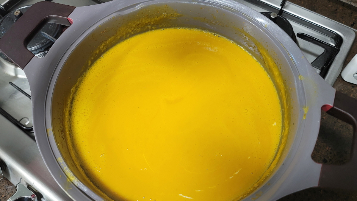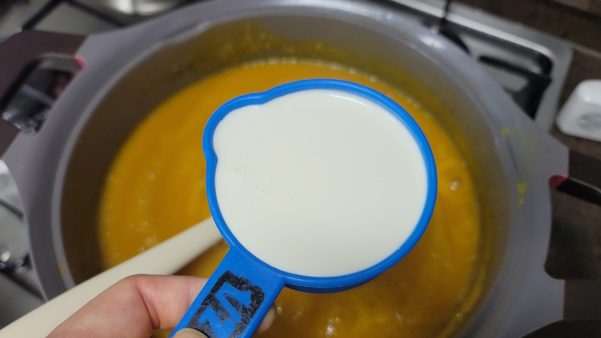 아직 점도는 없지만 그럴듯한 단호박죽 색깔이 나와요.